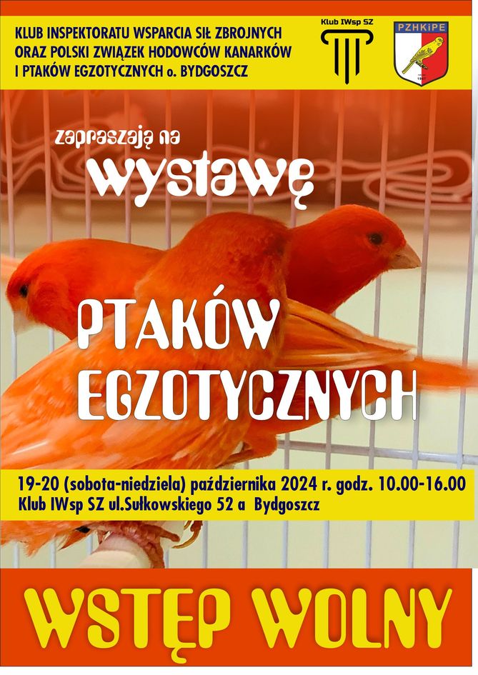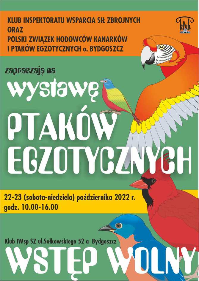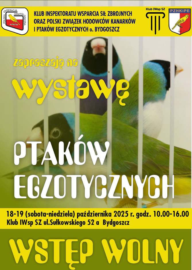 w dniu 6 kwietnia. Tegoroczna wystawa odbędzie się w dniach 18-19 października 2025r. Ponownie mamy zaszczyt gościć w Klubie Inspektoratu Wsparcia Sił Zbrojnych w Bydgoszczy. Zapraszamy wszystkich chętnych hodowców i miłośników ptaków egzotycznych do współudziału w naszej wystawie.